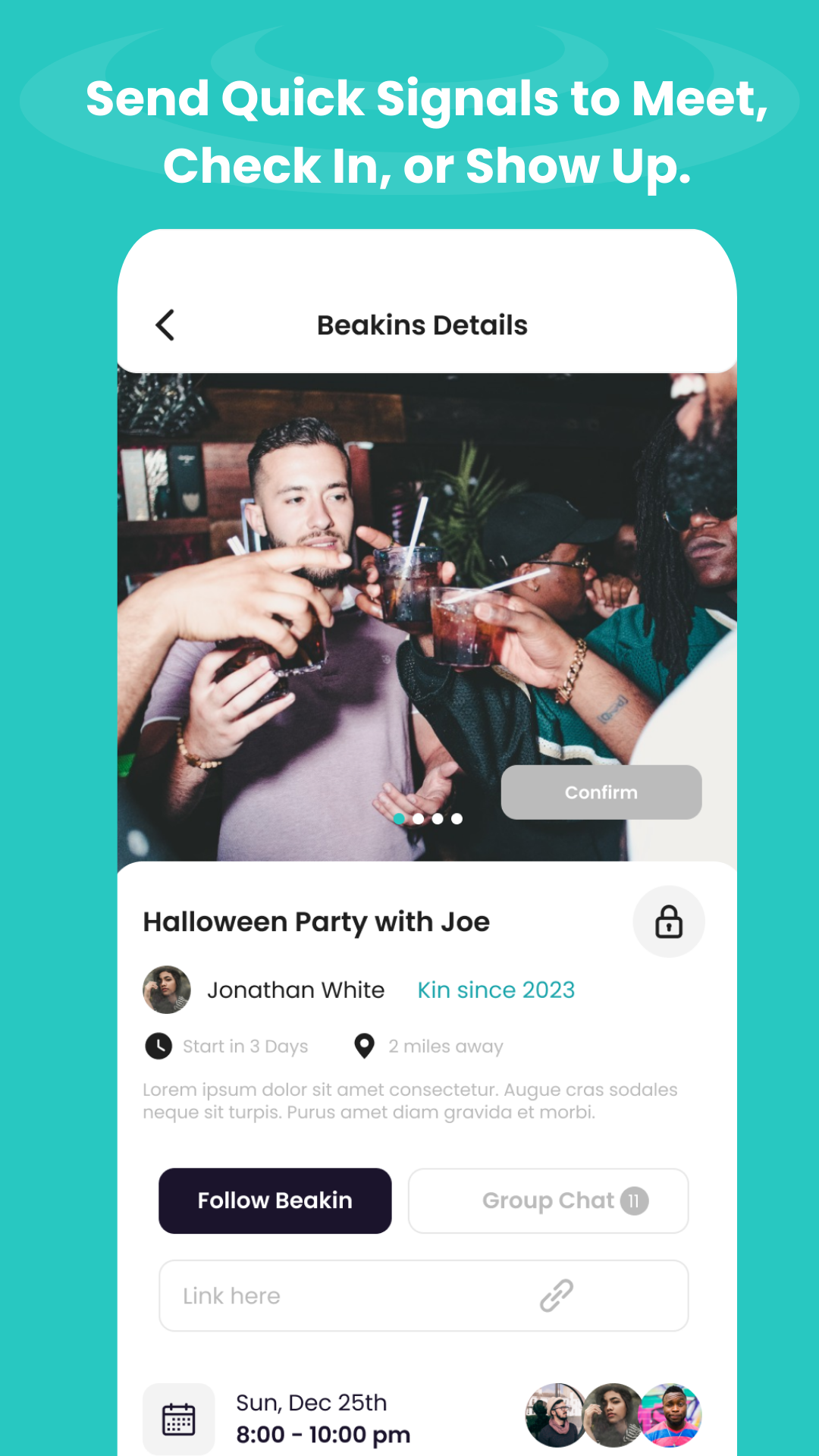 Use your phone to bring people together, not just scroll past them. Beakin helps you create and join real moments with your Kin.